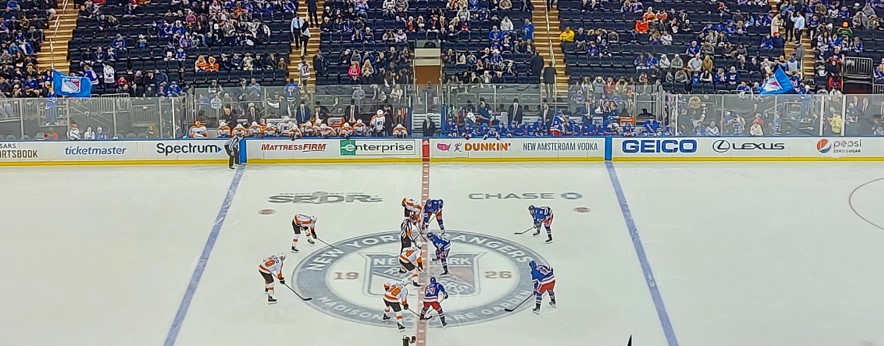 The head referee made his way to the centre of the rink where the teams were waiting for him. He stood between the two centre players and dropped the puck. And they were off! I thought games I had seen in the UK were fast – they were nothing compared to this! It took a few minutes for me to train my eyes and brain to be able to follow the puck! I had just about got there in time to see the Flyers score their first goal right before the 6 minute mark. As we were in New York and sitting firmly in the middle of the Rangers’ supporters – we were routing for the home team. The goal cut through the fans – the devastation was real. And it was not made any better when the Flyers scored again under a minute later. The thousands of us in our stand were gutted. All except one guy sat directly in front of us. He was trying not to react to the goals, and I could see, where the collar of his navy blue jumper had moved, the flash of a vibrant orange jersey. There was a Flyers supporter in our midst! We kept his secret and it was fun watching him watch the game with the rival’s fans.